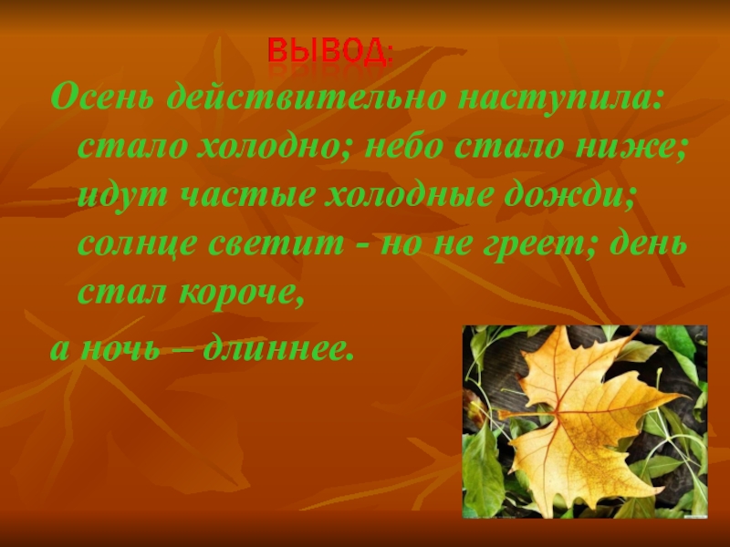 Слайд 29Осень действительно наступила: стало холодно; небо стало ниже; идут частые холодные