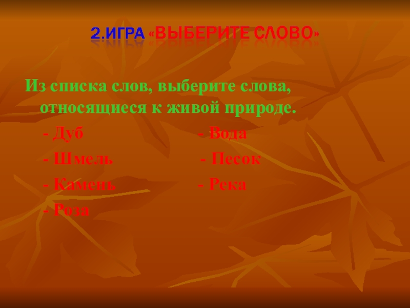 Слайд 27Из списка слов, выберите слова, относящиеся к живой природе.
