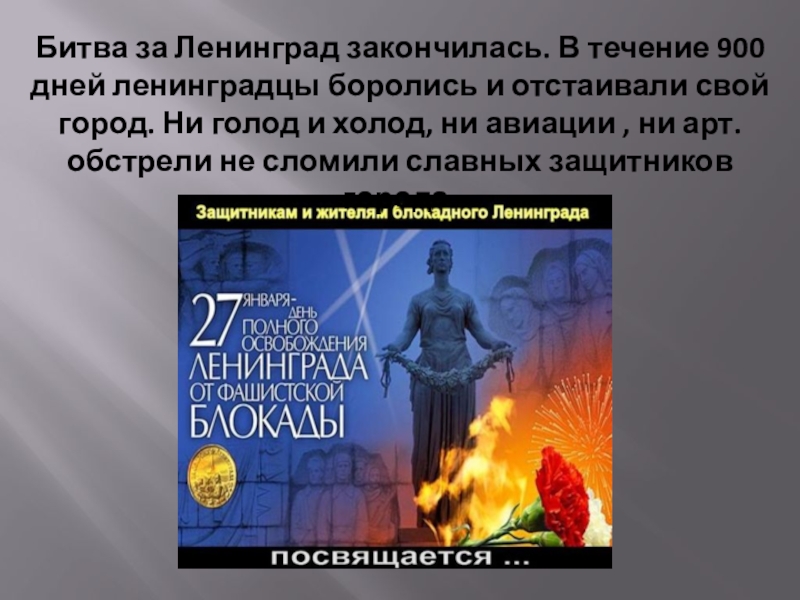 Слайд 6Битва за Ленинград закончилась. В течение 900 дней ленинградцы боролись и