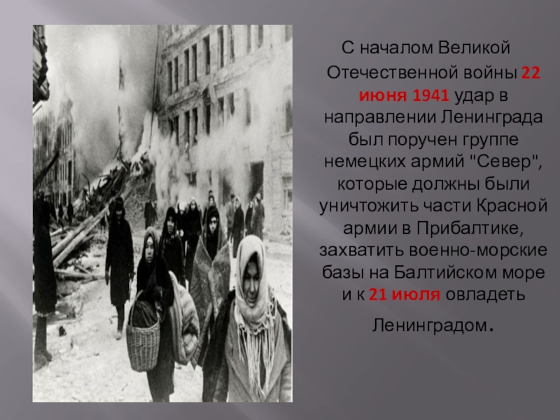 С началом Великой Отечественной войны 22 июня 1941 удар в направлении Ленинграда был поручен группе немецких армий "Север", которые должны были уничтожить части Красной армии в Прибалтике, захватить военно-морские базы на Балтийском море и к