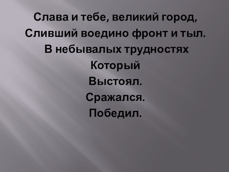 Слава и тебе, великий город,Сливший воедино фронт и тыл. В небывалых трудностях КоторыйВыстоял.Сражался.Победил.