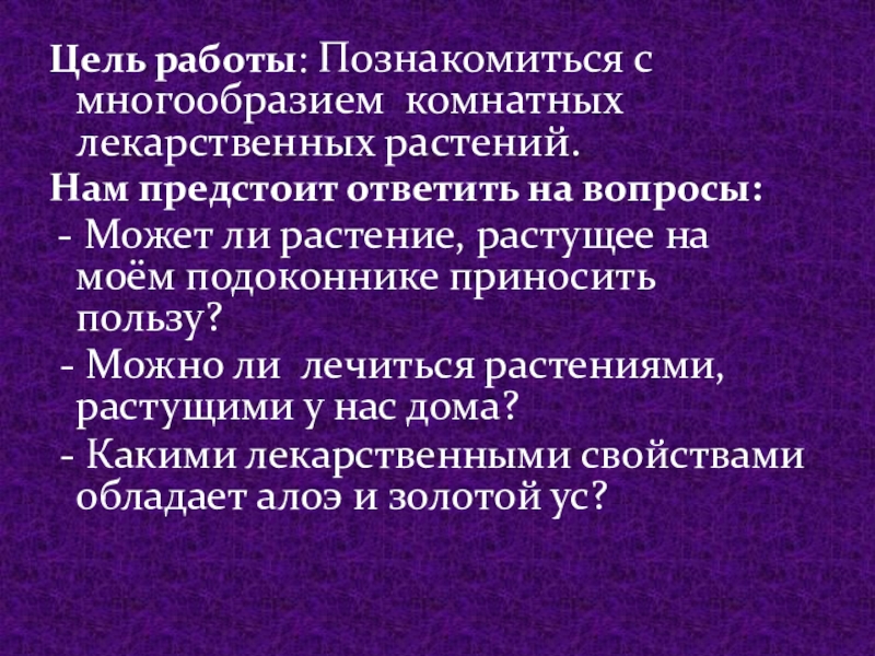 Слайд 2Цель работы: Познакомиться с многообразием комнатных лекарственных растений.