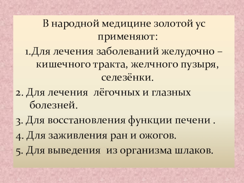 Слайд 15В народной медицине золотой ус применяют: