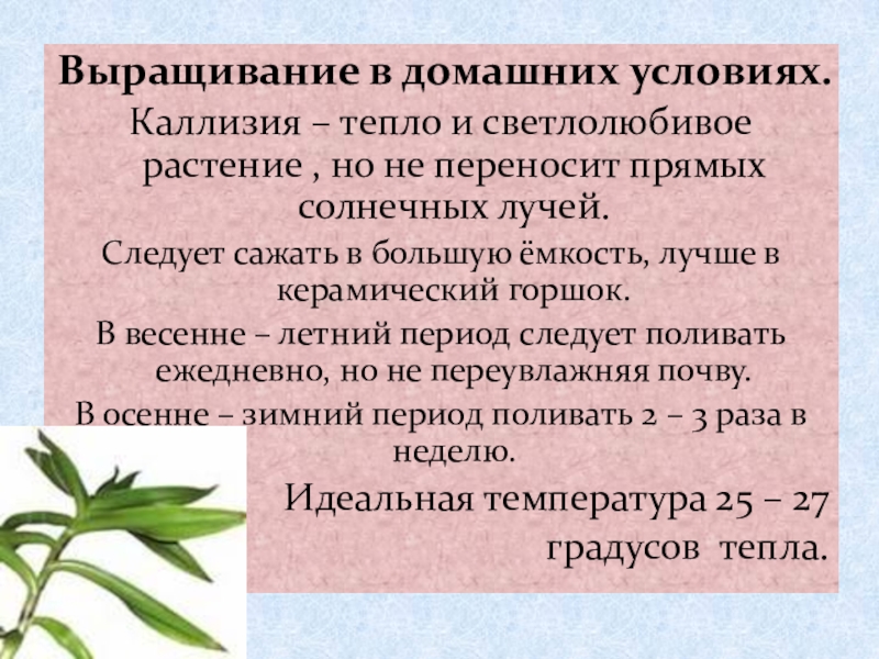 Каллизия – тепло и светлолюбивое растение , но