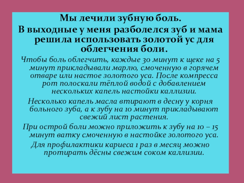 Чтобы боль облегчить, каждые 30 минут к щеке на 5 минут прикладывали марлю, смоченную в горячем отваре или настое золотого уса. После компресса рот полоскали тёплой водой с добавлением нескольких капель настойки каллизии.