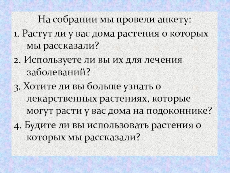 Слайд 22На собрании мы провели анкету: