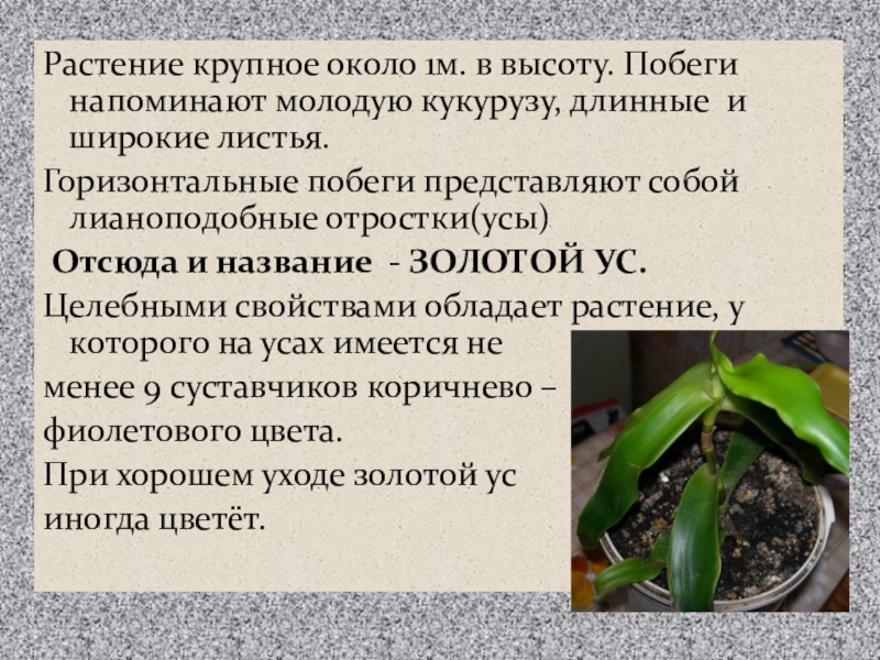 Слайд 14Растение крупное около 1м. в высоту. Побеги напоминают молодую кукурузу, длинные