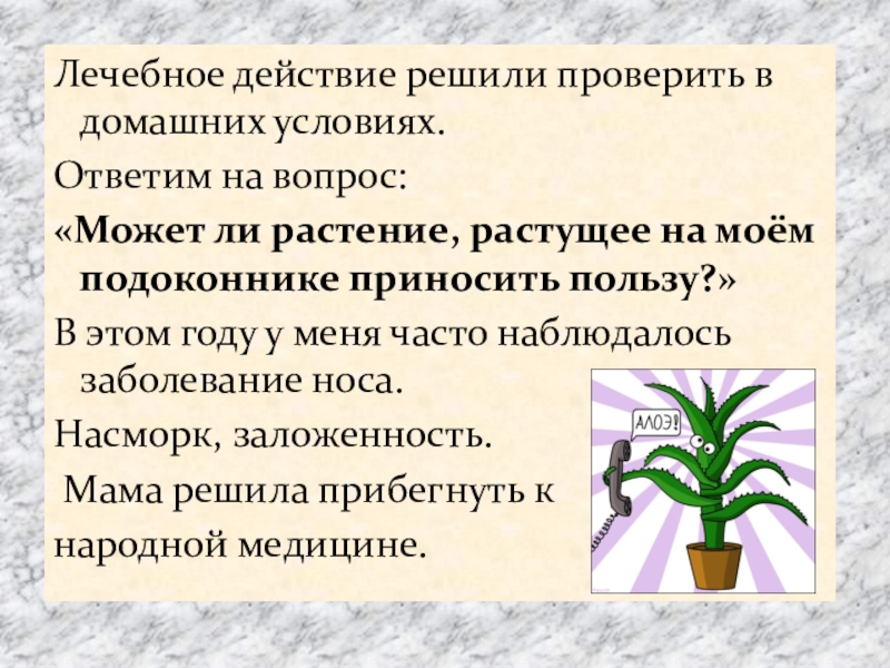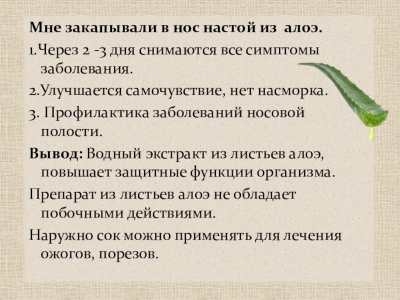 Слайд 11Мне закапывали в нос настой из алоэ.