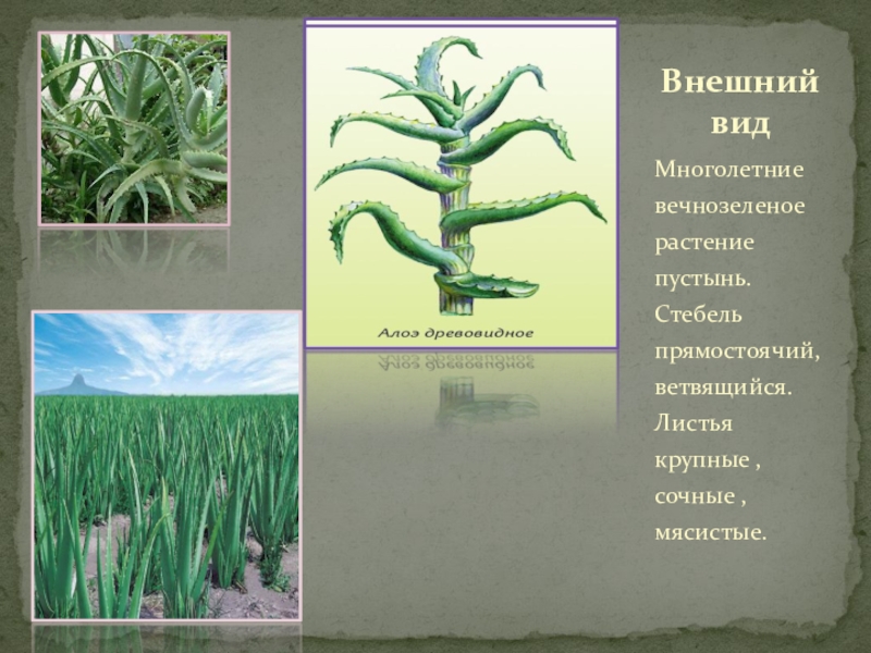 Слайд 7Многолетние вечнозеленое растение пустынь. Стебель прямостоячий, ветвящийся. Листья крупные ,