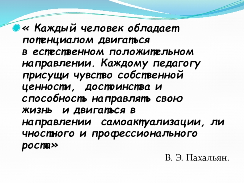 « Каждый человек обладает потенциалом двигаться в естественном положительном направлении. Каждому педагогу присущи чувство собственной ценности,  достоинства и способность направлять свою жизнь  и двигаться в направлении  самоактуализации, личностного и профессионального роста»В. Э. Пахальян.
