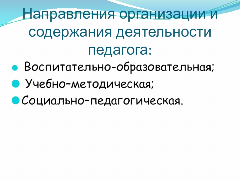 Направления организации и содержания деятельности педагога: Воспитательно-образовательная; Учебно–методическая;Социально–педагогическая.
