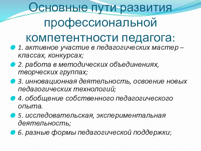 Основные пути развития профессиональной компетентности педагога: 1. активное участие в педагогических мастер – классах, конкурсах;2. работа в