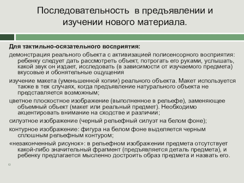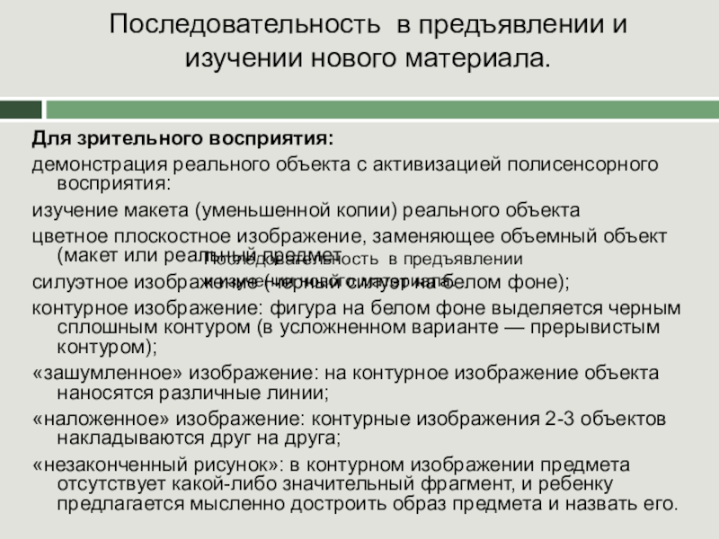 От общего к частному: изучение объекта следует начинать с основных признаков, позволяющих отличить его от других объектов. Предъявляемый предмет должен быть максимально приближен к эталону (принцип натуральности). В некоторых случаях следует исключить излишние детали, способные затруднить начальное восприятие объекта.