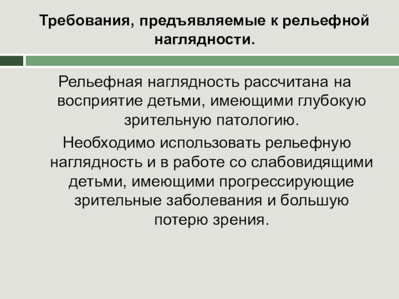 Слайд 15Требования, предъявляемые к рельефной наглядности.