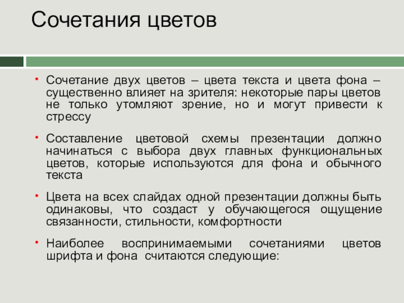 Цвета на всех слайдах одной презентации должны быть одинаковы, что создаст у обучающегося ощущение связанности, стильности, комфортности