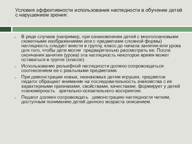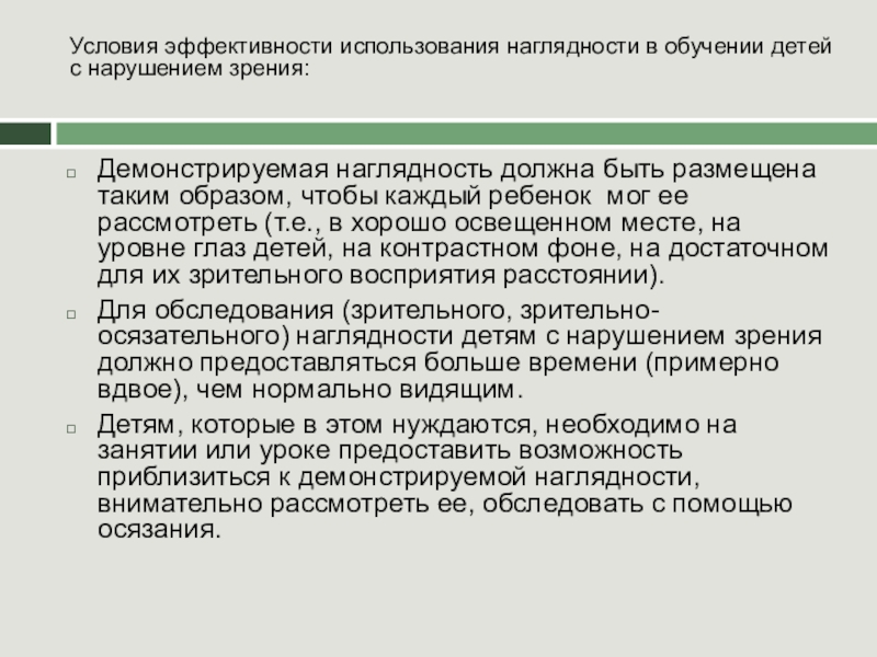 Условия эффективности использования наглядности в обучении детей с нарушением зрения:
