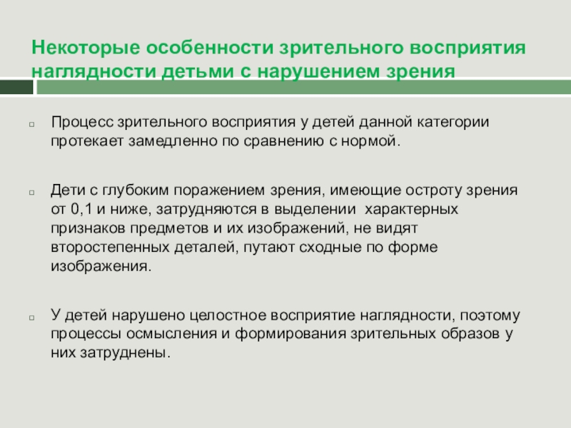 Слайд 3Некоторые особенности зрительного восприятия наглядности детьми с нарушением зрения