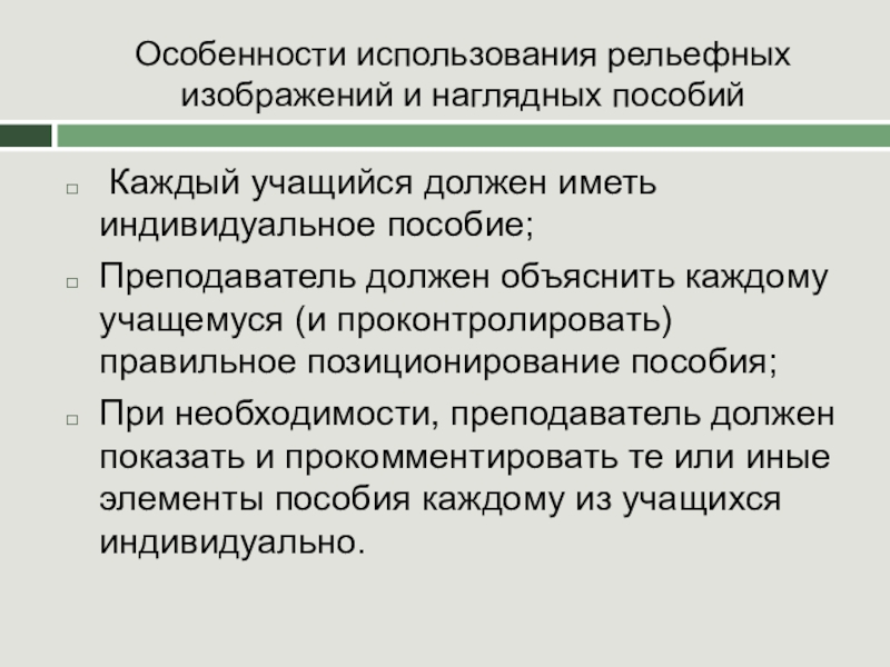 Слайд 16Особенности использования рельефных изображений и наглядных пособий