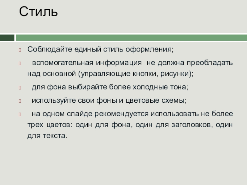 на одном слайде рекомендуется использовать не более трех цветов: один для фона, один для заголовков, один для текста.