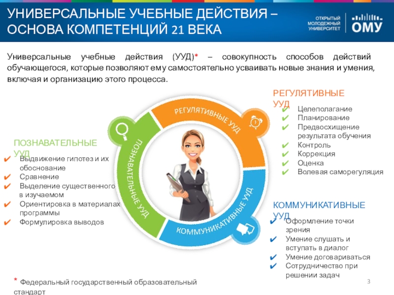 Универсальные учебные действия (УУД)* – совокупность способов действий обучающегося, которые позволяют ему самостоятельно усваивать новые знания и умения, включая и организацию этого процесса.