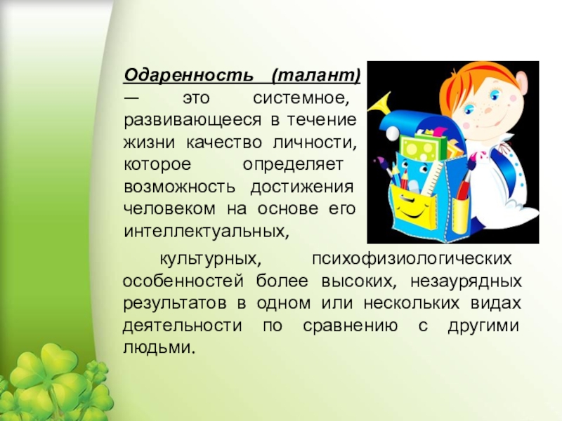 Одаренность (талант) — это системное, развивающееся в течение жизни качество личности, которое определяет возможность достижения человеком на основе его интеллектуальных,