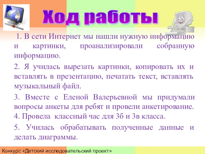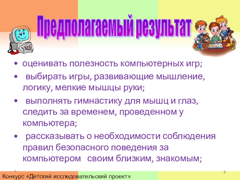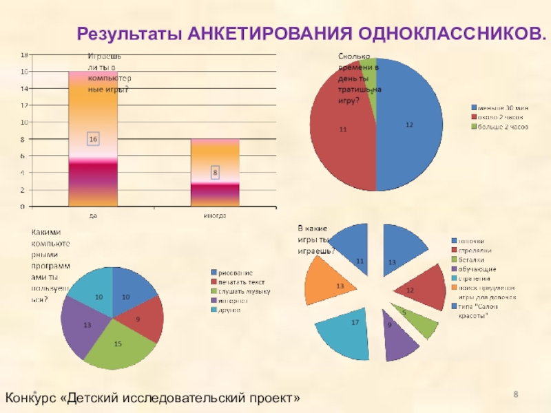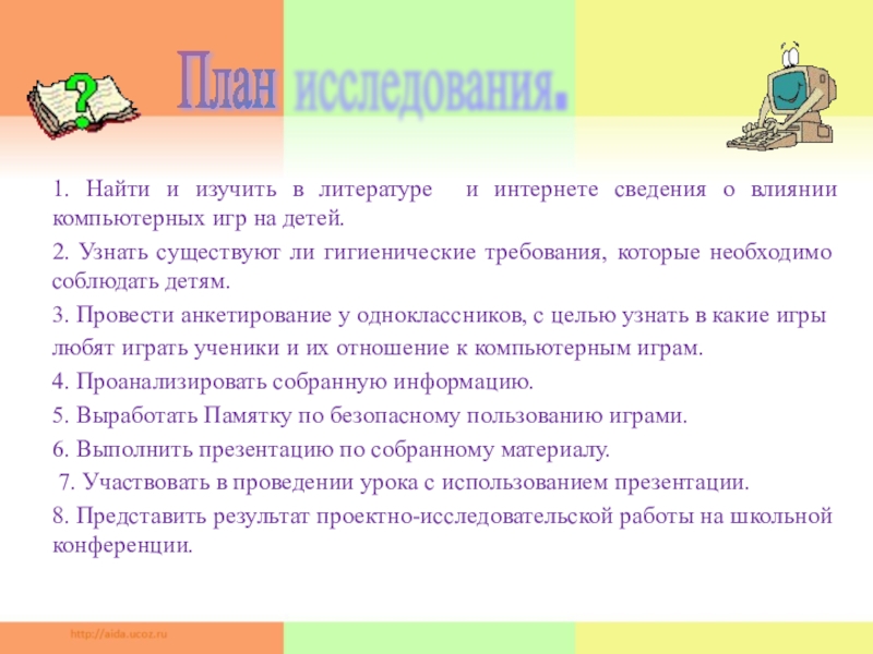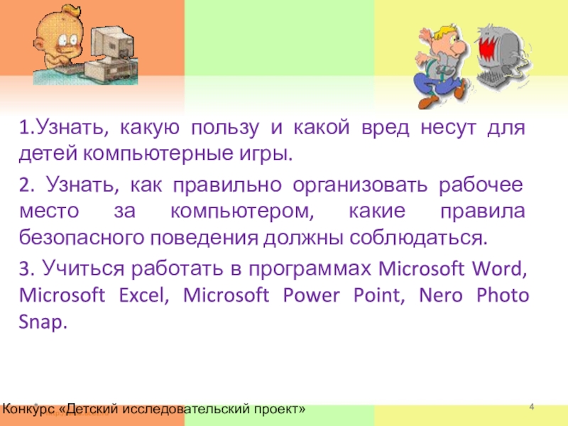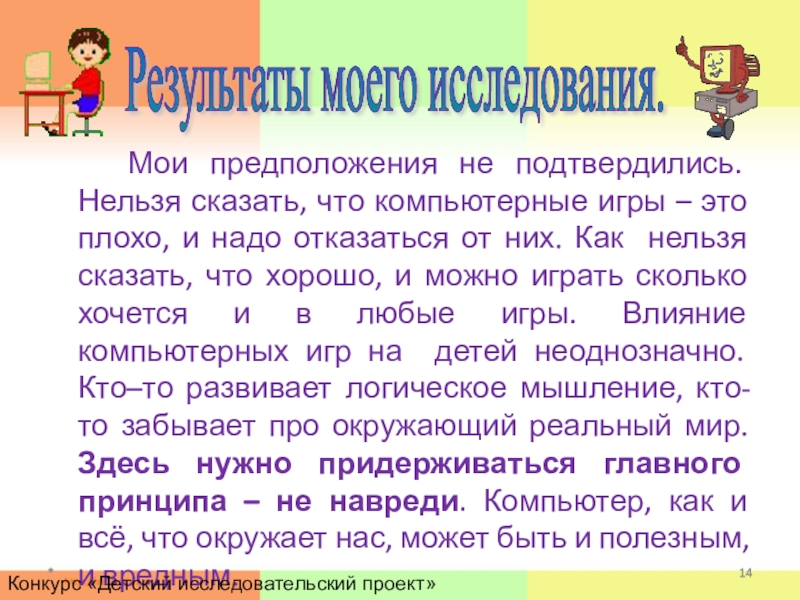 Результаты проведенного исследования показали, что почти все ребята в классе (21 чел из 24) имеют дома компьютер, учатся пользоваться разными программами, но большую часть времени проводят за играми. Немногие задумываются о вреде и пользе этих игр, как и о том, сколько времени можно играть.