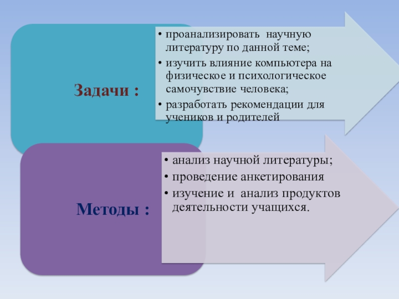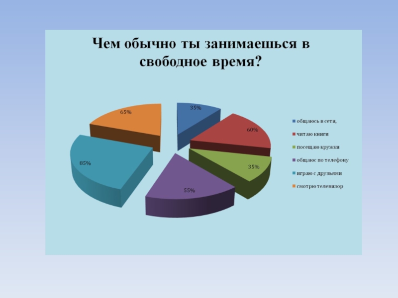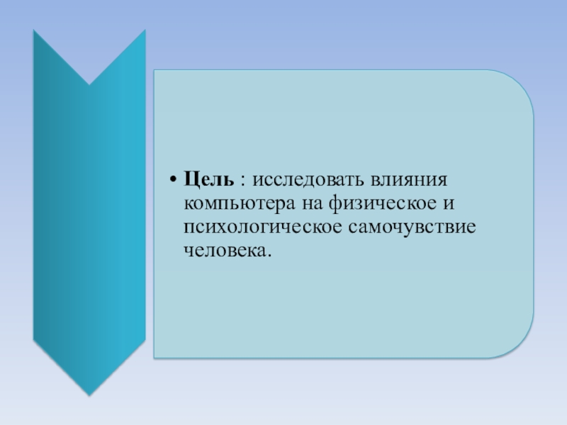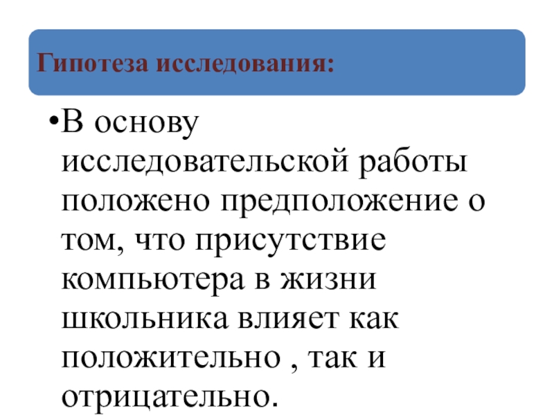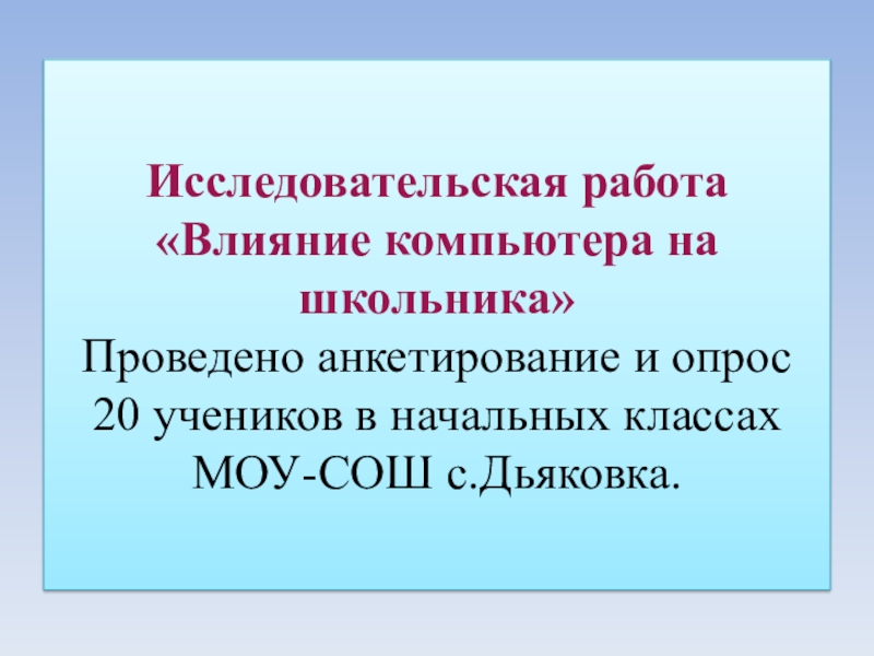 Слайд 13Исследовательская работа «Влияние компьютера на школьника» Проведено анкетирование и опрос 20