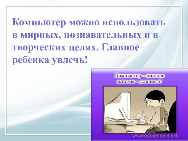 Слайд 17Компьютер можно использовать в мирных, познавательных и в творческих целях. Главное