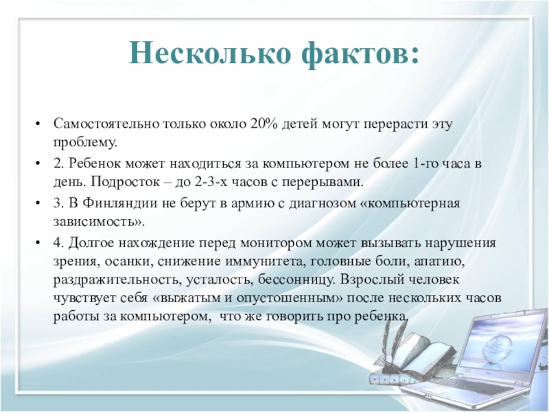 4. Долгое нахождение перед монитором может вызывать нарушения зрения, осанки, снижение иммунитета, головные боли, апатию, раздражительность, усталость, бессонницу. Взрослый человек чувствует себя «выжатым и опустошенным» после нескольких часов работы за компьютером, что же говорить про ребенка.
