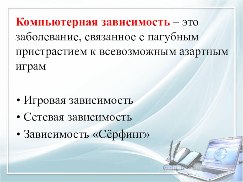 Слайд 4Компьютерная зависимость – это заболевание, связанное с пагубным пристрастием к всевозможным