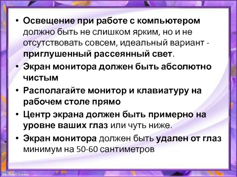 Слайд 17Освещение при работе с компьютером должно быть не слишком ярким, но