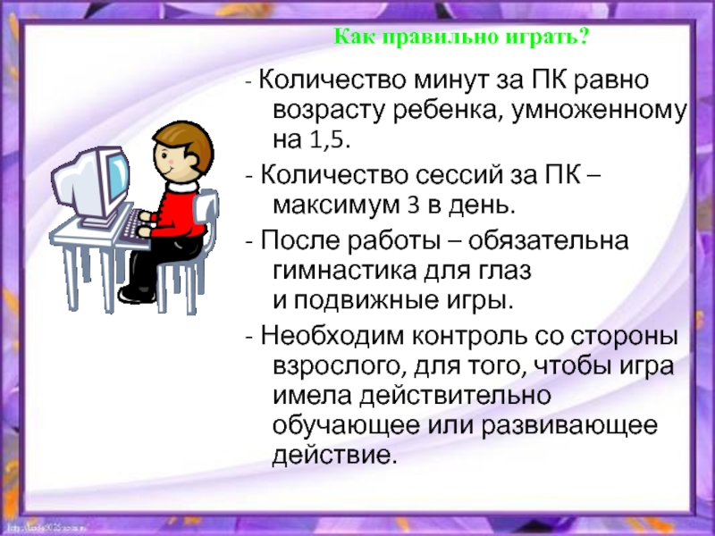 - Количество минут за ПК равно возрасту ребенка, умноженному на 1,5.