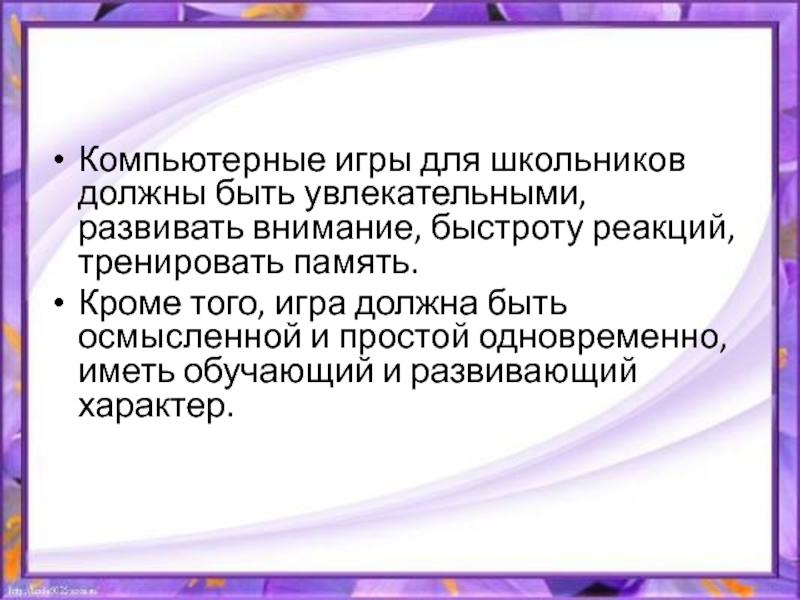 Слайд 15Компьютерные игры для школьников должны быть увлекательными, развивать внимание, быстроту реакций,