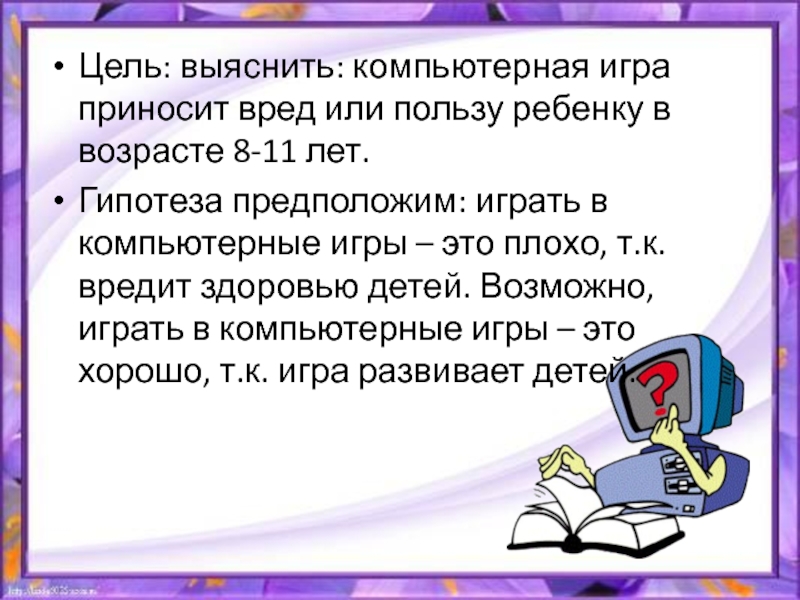 Слайд 2Цель: выяснить: компьютерная игра приносит вред или пользу ребенку в возрасте