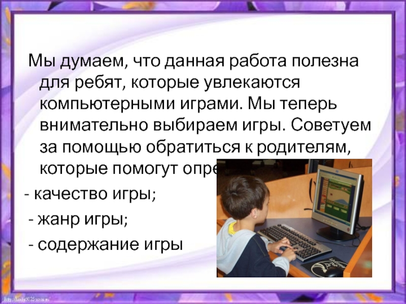 компьютерными играми. Мы теперь внимательно выбираем игры. Советуем за помощью обратиться к родителям, которые помогут определить: