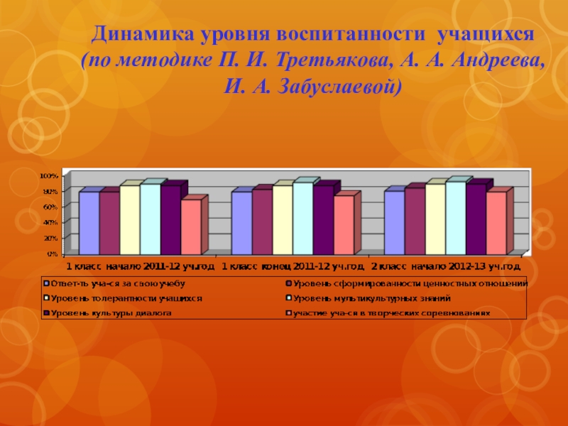 Слайд 18Динамика уровня воспитанности учащихся (по методике П. И. Третьякова, А. А. Андреева,