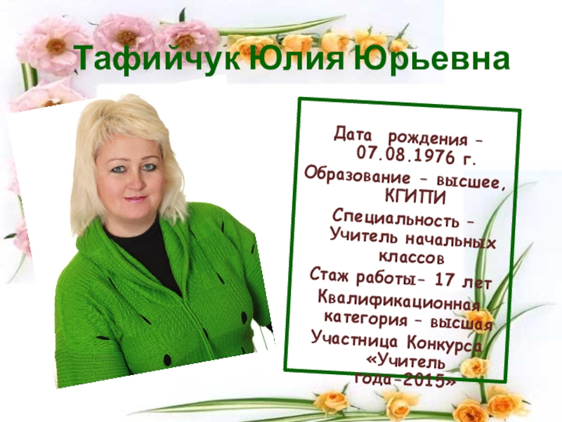 Тафийчук Юлия ЮрьевнаДата рождения – 07.08.1976 г. Образование - высшее, КГИПИСпециальность –Учитель начальных классовСтаж работы- 17 лет Квалификационная категория – высшаяУчастница Конкурса «Учитель года-2015»