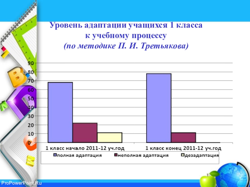 Слайд 16Уровень адаптации учащихся 1 класса к учебному процессу (по методике П.