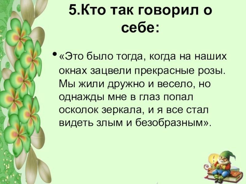 зацвели прекрасные розы. Мы жили дружно и весело, но однажды мне в глаз попал осколок зеркала, и я все стал видеть злым и безобразным».