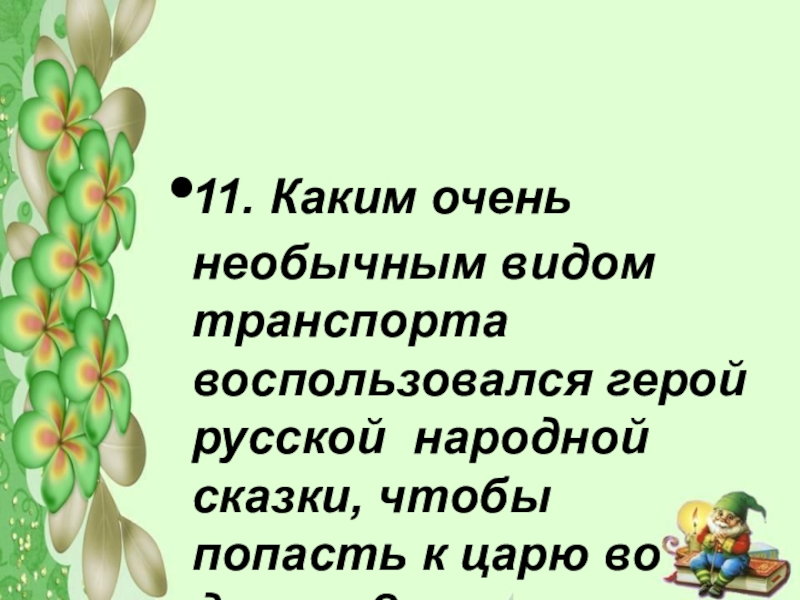 Слайд 1411. Каким очень необычным видом транспорта воспользовался герой русской народной сказки,