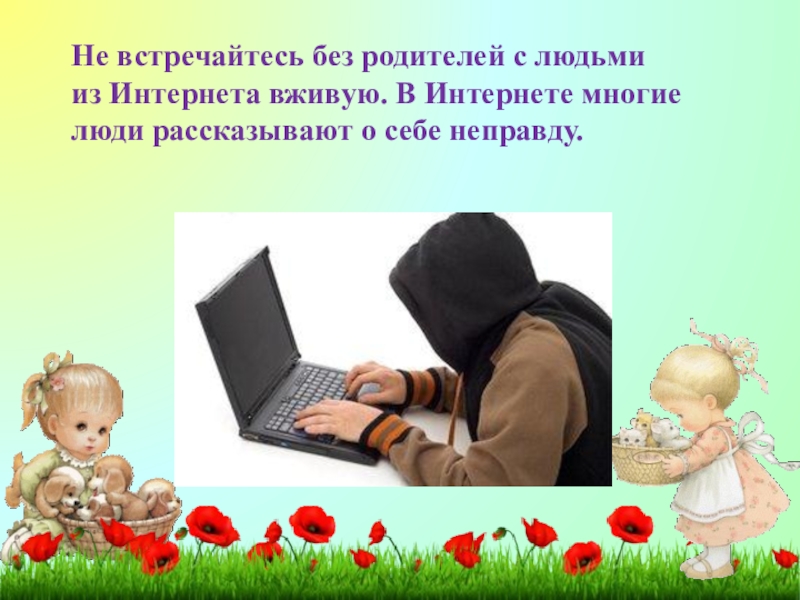 Не встречайтесь без родителей с людьми из Интернета вживую. В Интернете многие люди рассказывают о себе неправду.