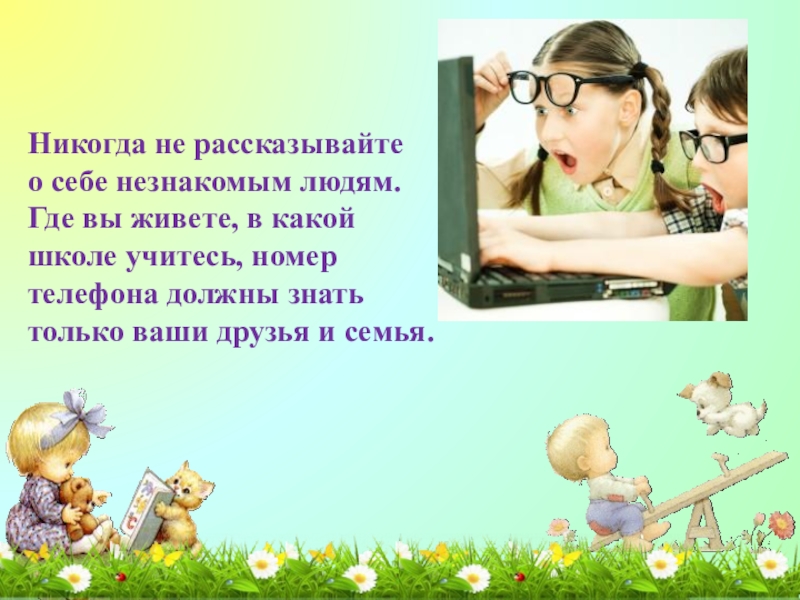 Слайд 5Никогда не рассказывайте о себе незнакомым людям. Где вы живете, в какой школе учитесь, номер