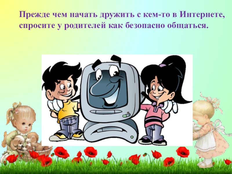 Слайд 4Прежде чем начать дружить с кем-то в Интернете, спросите у родителей как безопасно общаться.