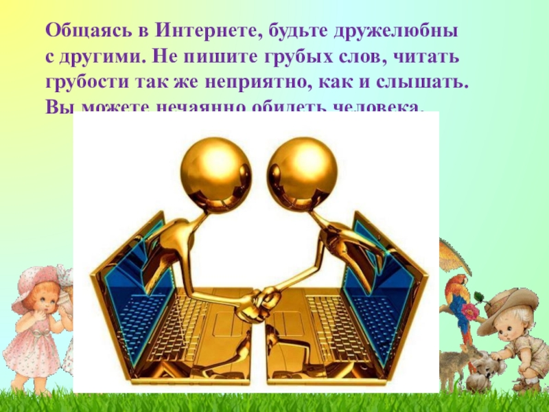 Слайд 8Общаясь в Интернете, будьте дружелюбны с другими. Не пишите грубых слов, читать грубости так