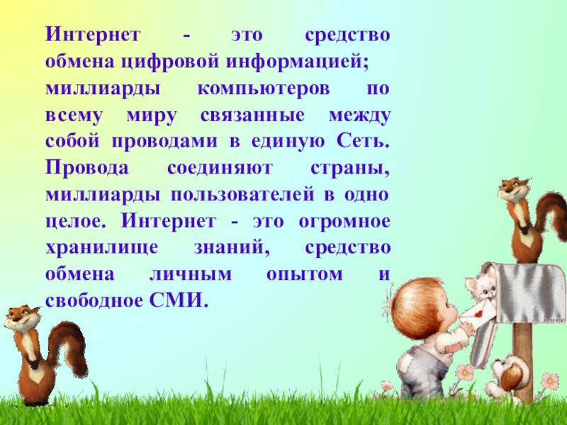 Интернет - это средство обмена цифровой информацией; миллиарды компьютеров по всему миру связанные между собой проводами в единую Сеть. Провода соединяют страны, миллиарды пользователей в одно целое. Интернет - это огромное хранилище знаний, средство обмена личным опытом и