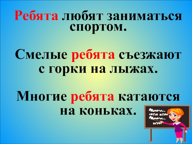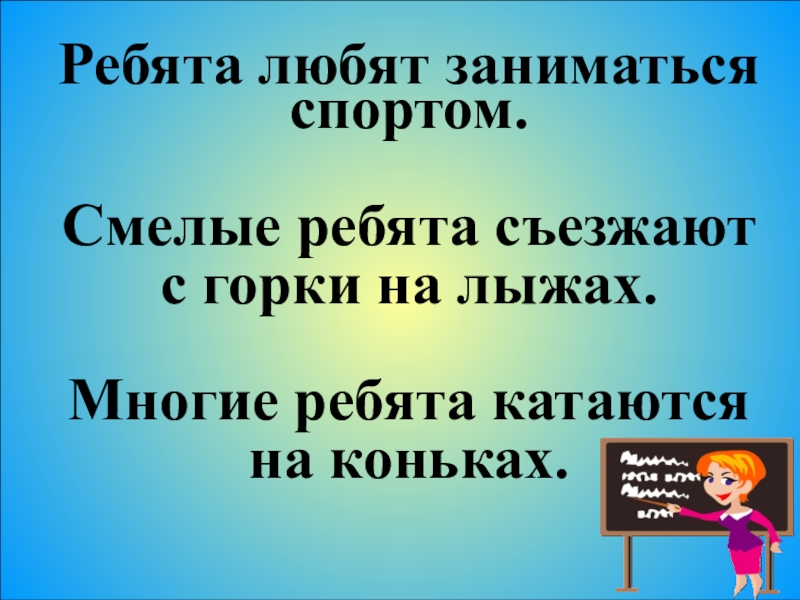 Ребята любят заниматься спортом.Смелые ребята съезжают с горки на лыжах.Многие ребята катаются на коньках.