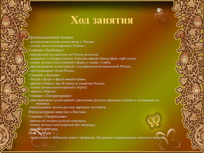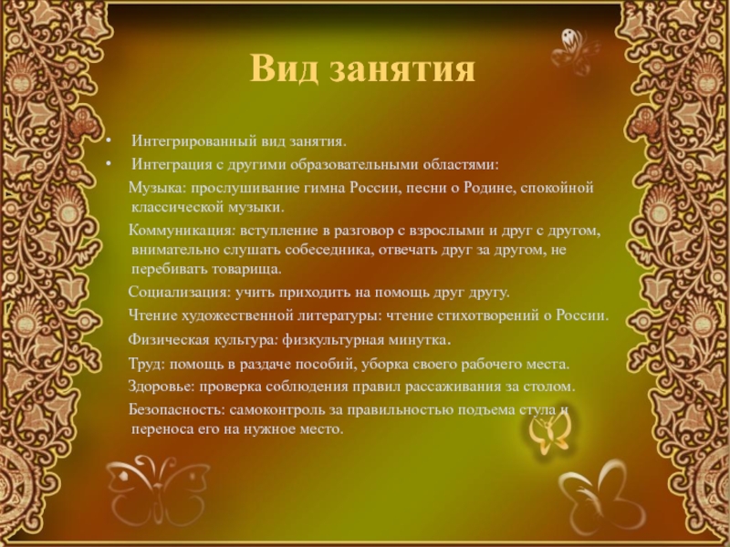 прослушивание гимна России, песни о Родине, спокойной классической музыки.
