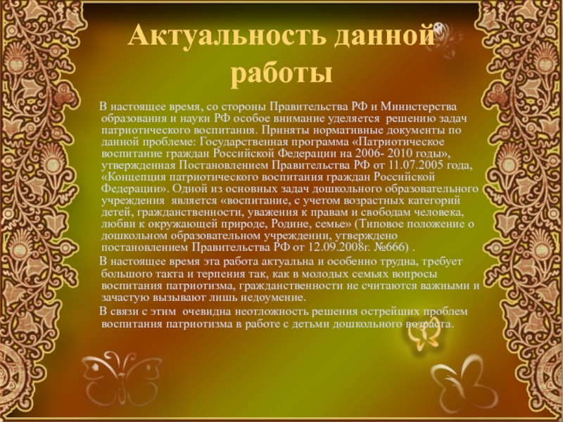 РФ и Министерства образования и науки РФ особое внимание уделяется решению задач патриотического воспитания. Приняты нормативные документы по данной проблеме: Государственная программа «Патриотическое воспитание граждан Российской Федерации на 2006- 2010 годы», утвержденная Постановлением Правительства РФ от 11.07.2005 года, «Концепция патриотического воспитания граждан Российской Федерации». Одной из основных задач дошкольного образовательного учреждения является «воспитание, с учетом возрастных категорий детей, гражданственности, уважения к правам и свободам человека, любви к окружающей природе, Родине, семье» (Типовое положение о дошкольном образовательном учреждении, утверждено постановлением Правительства РФ от 12.09.2008г. №666) .