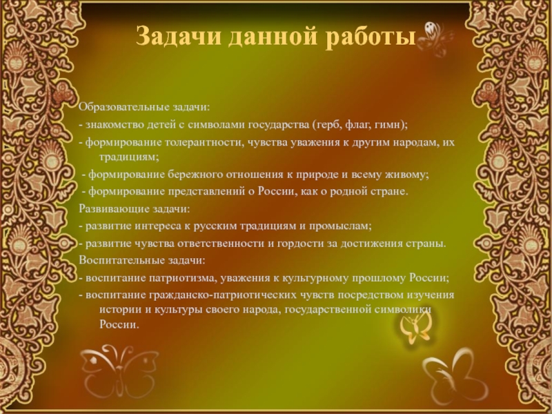 - воспитание гражданско-патриотических чувств посредством изучения истории и культуры своего народа, государственной символики России.
