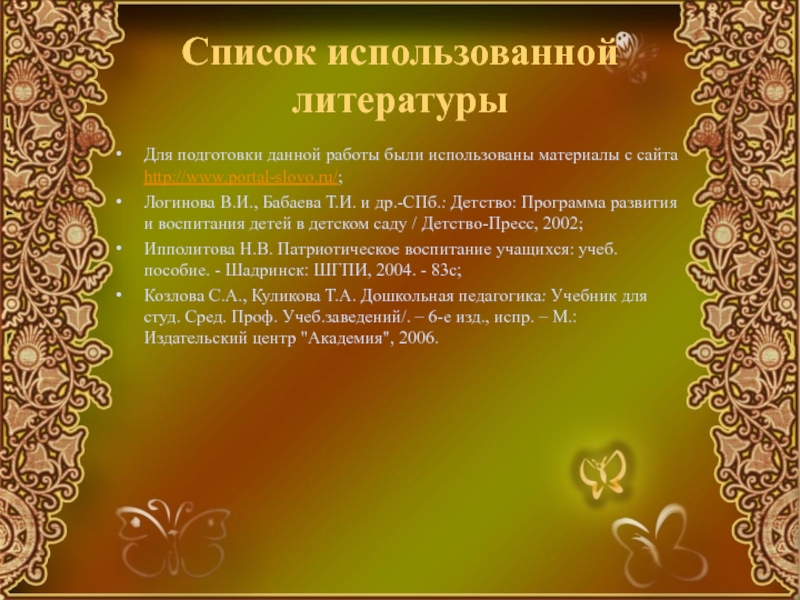 Козлова С.А., Куликова Т.А. Дошкольная педагогика: Учебник для студ. Сред. Проф. Учеб.заведений/. – 6-е изд., испр. – М.: Издательский центр "Академия", 2006.